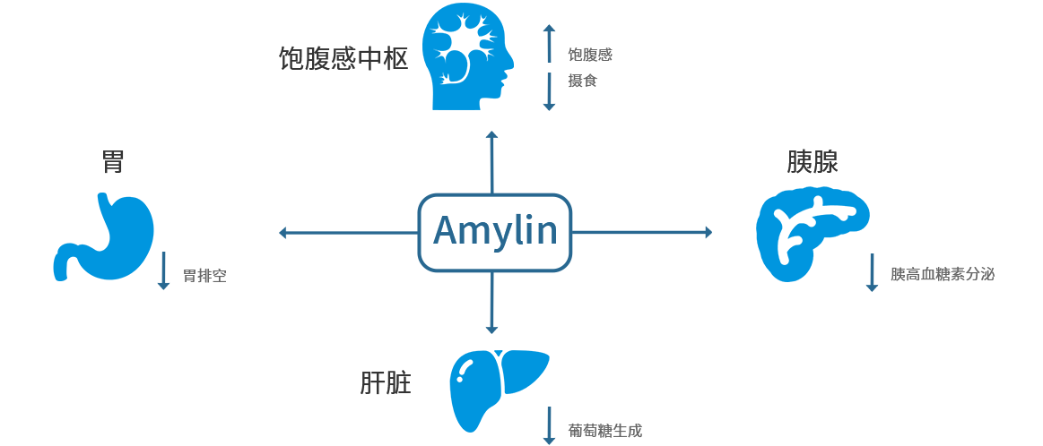 Amylin(胰淀素)是一種由胰腺β細胞產(chǎn)生并與胰島素共同分泌的37個氨基酸的肽類激素。Amylin可降低食欲和減緩胃排空,Amylin類似物通過不同的Amylin受體增加飽腹感,并增強瘦素敏感性。由于內(nèi)源性Amylin作用時間短,藥物研發(fā)人員已研發(fā)出用于治療的長效型Amylin類似物。